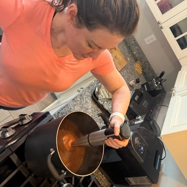 The chicken alone turned into a three-act play. First, season and grill the breasts. Then cut them into small pieces. Then re-season and throw them into a screaming hot cast iron to char the edges before setting aside for a Bottomer™. Same thing with the veggies. Some went into the broth before blending to build the base. The rest got set aside, thrown into cast iron, and scorched! Those got added back in after the blend.