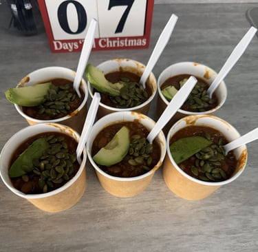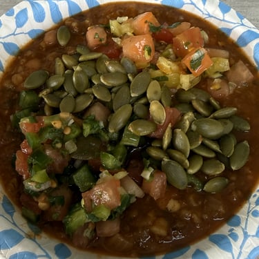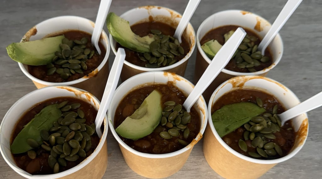 On the menu today was a nice cup of Butternut Bulgur Chili, paired with Island Heat Jamaican Jerk Jackfruit Tacos. For the accoutrements, because Soup Club energy never takes a day off, we had two varieties of hand cut salsa, sliced avocado, and pumpkin seeds.