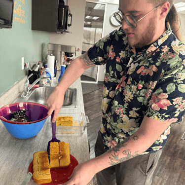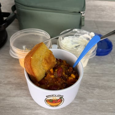 Anyways, time for the big day: soup club day. Whispers were already going throughout the office: chili today and homemade cornbread. It already simmered a good hour and a half back home, but the flavors got to meld together for another 4 and a half hours at the office, which anyone will tell you, time is the key to a good chili. Everyone was lining up as I reheated the cornbread and set out the toppers (Shredded sharp cheddar and Greek yogurt in place of sour cream). Even more exciting, we got to add a new member today, Adam! Safe to say, a lot was riding on this chili today…