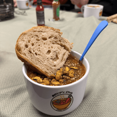 Adam proudly announced he skipped his morning bagel in anticipation of soup, though he did admit a banana happened earlier. Two bowls later, he landed on a 9.3.